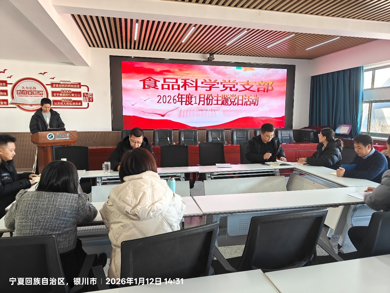 2026.01.142026年1月12日下午,食品科学党支部全体党员按照学校党委和学院党总支要求,在明远楼512会议室召开2025年度组织生活会和2026年1月主题党日活动。党支部坚持把深学细悟习近平总书记最新重要讲话精神作为第一议题,本次会议由崔保中同志领学《学习好贯彻好党的二十届四中全会精神》。他围绕“深刻领会‘十五五’时期经济社会发展的重大意义、党中央对国内外形势的科学判断、指导思想与重大原则、统筹发展与安全的根本要求、全面从严治党永远在路上的坚韧执着”五个方面展开学习。随后,大家对标中央政治局民主生活会提出的要求,就“学懂弄通做实习近平新时代中国特色社会主义思想、维护党中央权威、落实中央八项规定精神、抓实分管工作”进行讨论。接着,党支部书记潘琳解读了自治区党委十三届十二次全会公报,梳理“美丽新宁夏”建设任务,明确食品学科服务地方产业的具体方向。在组织生活会环节,支部党员对照“五个带头”标准,结合教学科研、人才培养、社会服务等岗位职责,逐一开展自我剖析,相互提出批评意见。党支部书记潘琳一一点评,并对大家提出的意见建议予以回应,提出整改建议。学院领导李文华书记和方海田副院长,以普通党员身份参加了组织生活会,并对会议进行了指导和点评。会议最后,以无记名投票方式开展党员民主测评,李文华、潘琳、章中、徐俊南4名同志被评为“优秀”等次。此次组织生活会主题聚焦、程序规范、氛围严肃,既是一次思想升华的精神洗礼,更是一次团结奋...