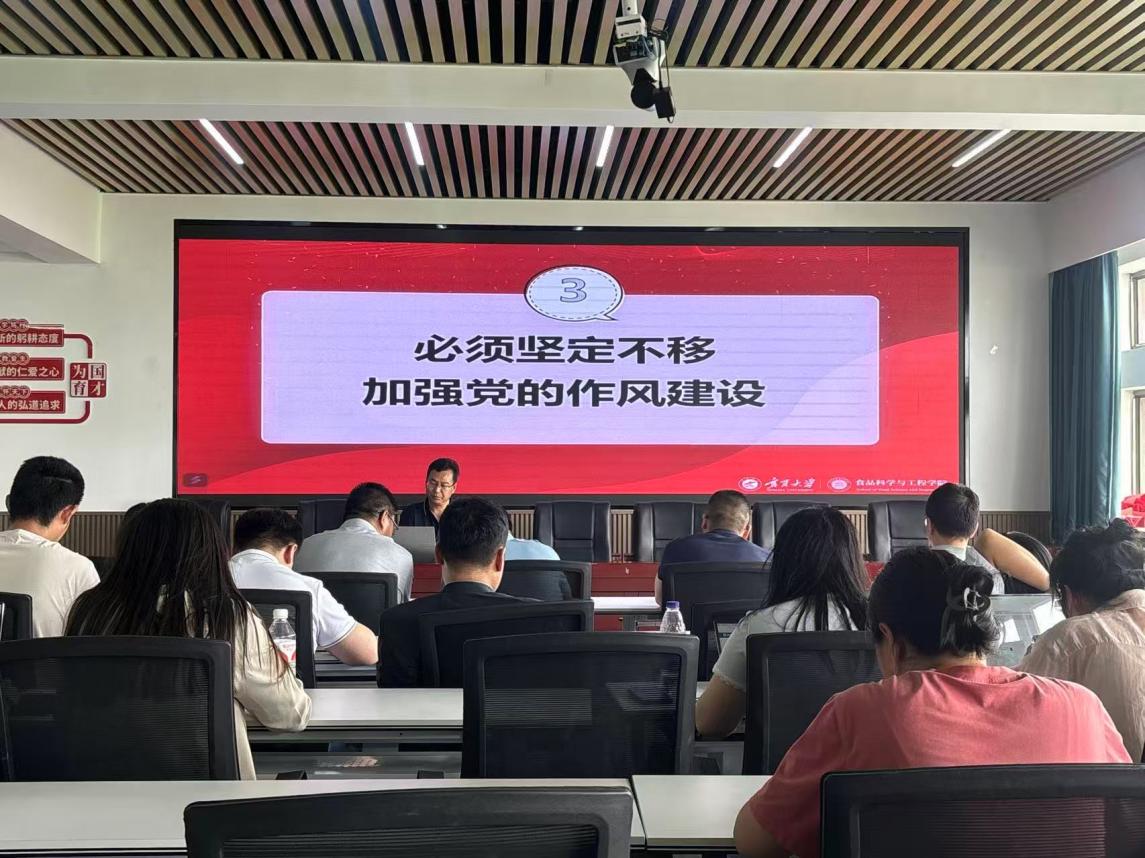 为扎实推进深入贯彻中央八项规定精神学习教育,认真落实习近平总书记关于加强党的作风建设的重要论述,食品科学与工程学院党总支于5月21日下午在明远楼512会议室组织开展学习教育专题党课讲座。讲座以“作风建设常抓不懈再出发——深入贯彻中央八项规定精神”为主题,由学院党总支书记李文华主讲,全体党员教师参加学习。