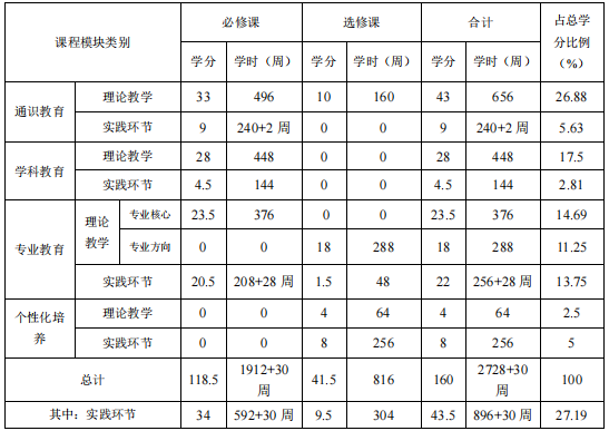 本专业毕业总学分要求171.5学分,其中通识教育课程52学分,学科教育课程32.5学分,专业教育课程63.5学分以及个性化培养课程12学分。