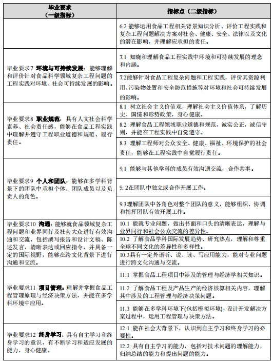 专业立足西部、面向全国,以培养德智体美劳全面发展的社会主义的合格建设者和可靠接班人为己任,秉承“不怕困难,不畏风寒;根深叶茂,本固枝荣”的“沙枣树精神”,培养具有艰苦创业、负重拼搏、勇于创新、开拓进取特质,能够在食品科学与工程领域,尤其是在自治区特色食品资源加工与利用方向从事食品加工生产、品质控制、工程设计、产品研发、经营管理等工作的创新型应用人才。预期学生毕业 5 年左右能达到: