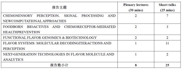 此次研讨会由慕尼黑工业大学(Technical University of Munich)T. Hofmann、吉森大学(Giessen University)H. Zorn、慕尼黑工业大学C. Dawid和V. Somoza四位学者组织筹办,共设置8场Keynote lectures(30 mins)、25场Scientific talks(25 mins)、13场Flash poster presentations(5 mins)和72个Posters。各个主题的报告数量见下图。