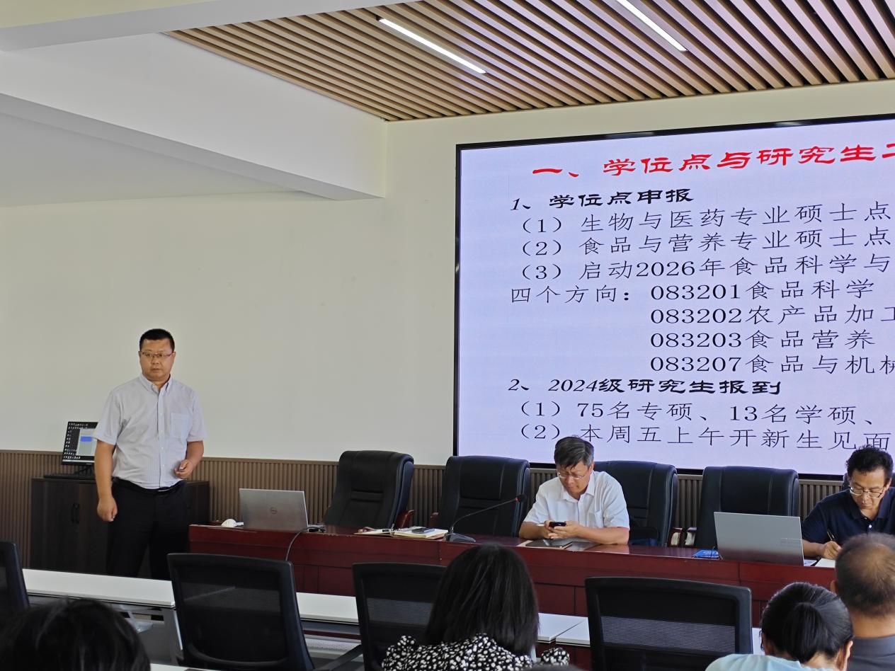 王松磊副院长对本科教学工作做出了安排部署。他强调了本科教学质量的重要性,并对本科教学评估、工程专业认证、一流教学组织建设、新专业申报、枸杞产业学院等方面的工作提出了具体要求和举措。方海田副院长就研究生教育工作做出了安排部署,并对硕士学位点获批、博士学位点申报、学院搬迁及对外交流等工作进行了汇报。