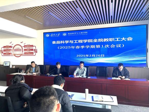 2月26日下午,食品科学与工程学院在明远楼五楼会议室召开2025年春季学期第一次全院大会,全面部署了新学期学院各项工作。会议由刘源院长主持,全体教职工参加,共同为学院的未来发展描绘新蓝图。