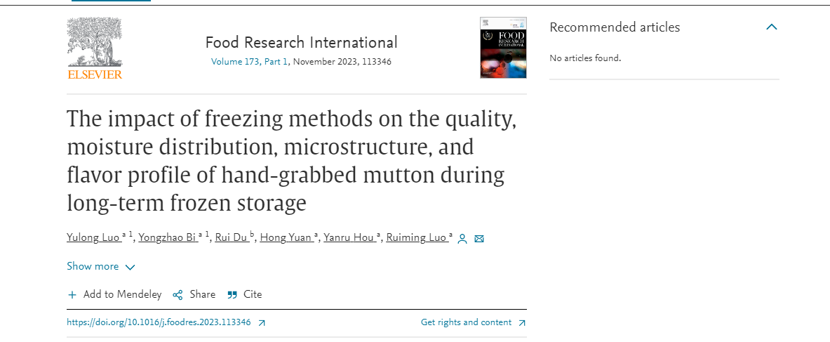 2023年8月6日,英国威廉集团官网食品科学与工程学院罗瑞明教授团队在国际食品Top期刊《Food Research International》(Q1,IF: 8.1)发表题为“The impact of freezing methods on the quality, moisture distribution, microstructure, and flavor profile of hand-grabbed mutton during long-term frozen storage”的研究性论文。