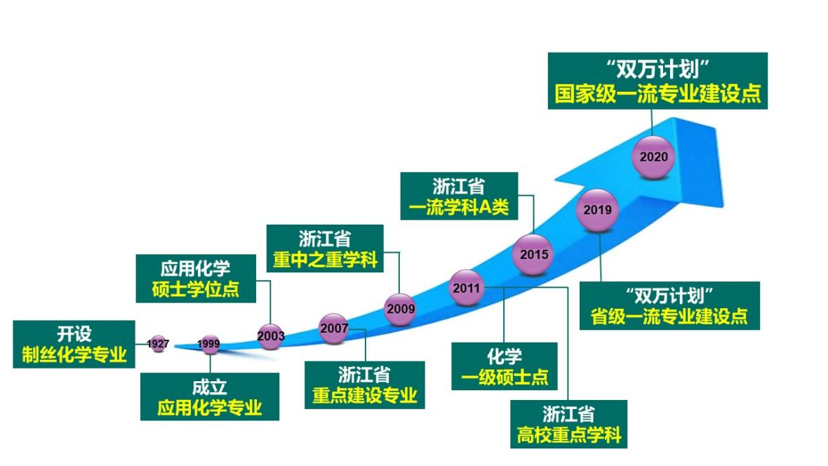 应用化学专业可追溯至1927年成立的制丝化学专业,正式成立于1999年,2007年获批浙江省重点建设专业。2019年获批“双万计划”浙江省一流本科专业建设点,2020年获批“双万计划”国家级一流本科专业建设点。