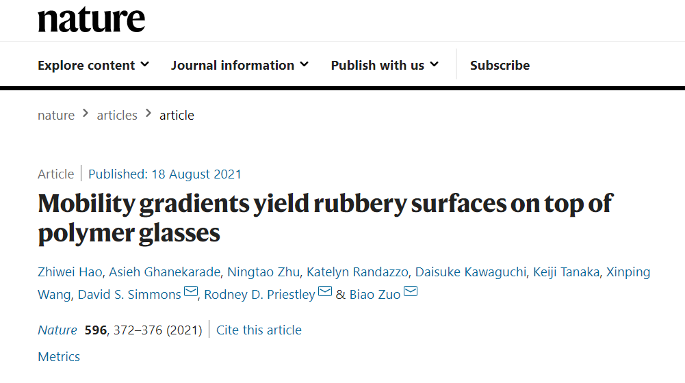 2022年,重点实验室左彪博士、王新平教授,美国普林斯顿大学Rodney Priestley教授,美国南佛罗里达大学David Simmons教授和日本九州大学Keiji Tanaka教授合作,以浙江理工大学为第一署名单位撰写的论文在《Nature》正刊发表。左彪为论文通讯作者,Priestley和Simmons为共同通讯作者;浙江理工大学硕士生郝治伟为第一作者,发表了在表面高分子链微观动力学机制上取得的重要研究成果。这是我校在自然科学领域的重大科研突破。