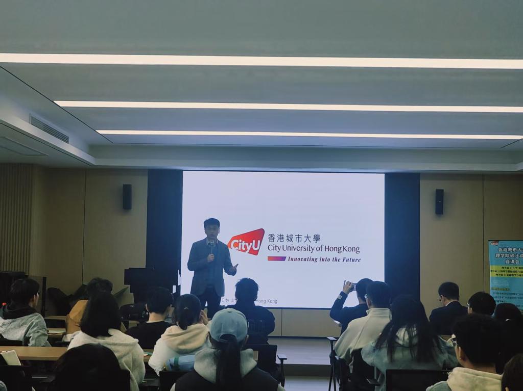 左彪对李丹枫一行的到来表示欢迎,也向同学们分享了自己在香港城市大学访学的经历。李丹枫为大家播放港城大的宣传片,随后介绍了香港城市大学的环境、学习与科研氛围、人才培养、政策等,欢迎同学们报考港城大研究生。黄勃龙向同学们介绍了化学系理学硕士的课程、师资力量、仪器与国家重点实验室等。柴愚介绍了物理系的硕士课程结构、申请方式与流程等。