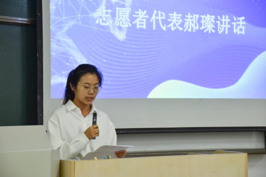 志愿者代表郝璨发言,她表示,志愿经历虽然很“累”,很多志愿者还要同时兼顾学业或科研任务,但感受更多的还是开心、满足与成长,化院“小青荷”坚守在每一个有需要的地方,在每一个领域发光发热,共同展现了化学青年的风采,贡献了浙理的青春力量。