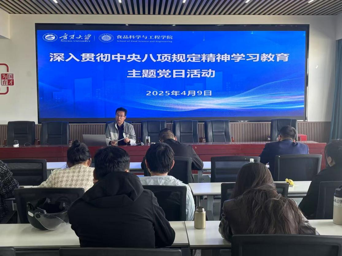 为深入贯彻中央八项规定精神学习教育,进一步加强党员教师思想政治建设,4月9日下午,食品科学与工程学院在明远楼512会议室组织开展“深入贯彻中央八项规定精神学习教育”主题党日活动。本次活动由学院李文华副书记主持,学院全体党员教师参加。