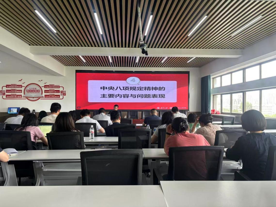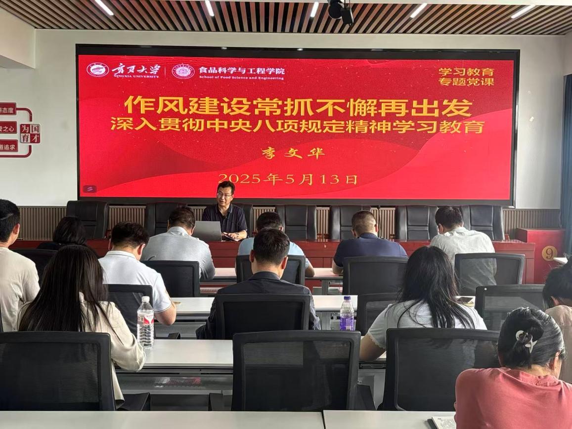 为扎实推进深入贯彻中央八项规定精神学习教育,认真落实习近平总书记关于加强党的作风建设的重要论述,食品科学与工程学院党总支于5月21日下午在明远楼512会议室组织开展学习教育专题党课讲座。讲座以“作风建设常抓不懈再出发——深入贯彻中央八项规定精神”为主题,由学院党总支书记李文华主讲,全体党员教师参加学习。