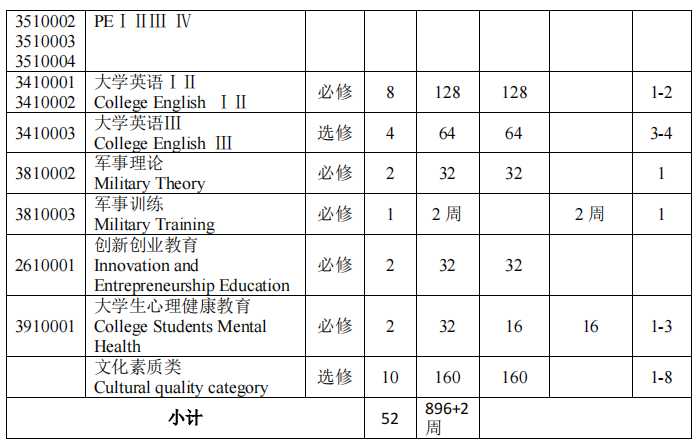 最低必修学分数42;最低选修学分数10;其中实验/实践环节修9学分。