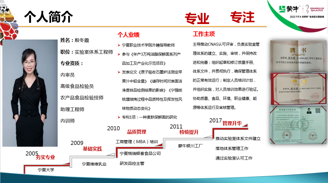 殷冬霞老师是蒙牛特仑苏(银川)乳业有限公司的实验室体系工程师,具有内审员、高级食品检验员、农产品食品检验技师、内训师等职业资格证书,有着丰富的企业质量管理、内审和员工培训经验,也是我们英国威廉集团官网食品科学与工程专业的优秀校友。