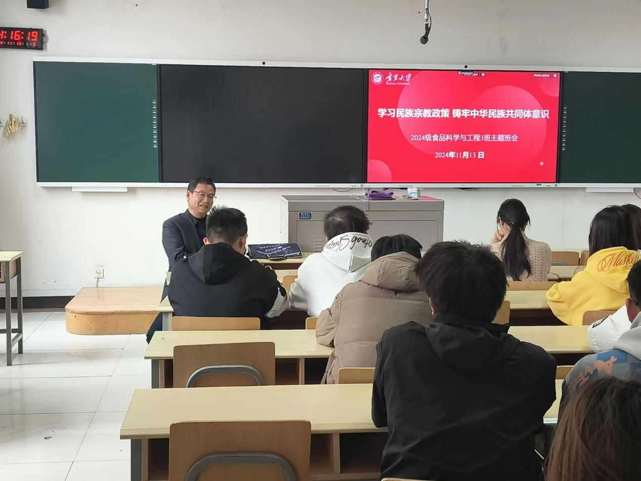 11月13日,食品科学与工程学院2024级食品科学与工程专业3班主题班会在文萃二教303教室召开。此次班会主题为“学习民族宗教政策,铸牢中华民族共同体意识”,会议由班主任雒雪丽老师主持,学院联系班级领导李文华副书记出席会议并作了宣讲。