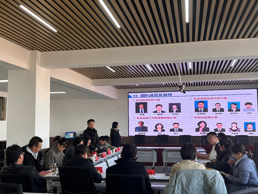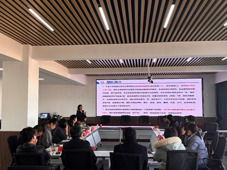 会上,我院乳业科技创新团队剧柠老师详细介绍了团队的成员构成、研究方向及科研成果。团队现有成员 14 人,其中教授6人,博士学历人员12名。近五年,团队在乳制品基础科学研究、乳品风味科学研究、乳酸菌菌种挖掘与利用等方面取得了丰硕成果,主持多项国家和自治区级科研项目,发表高水平论文 40 余篇,授权发明专利 5 项,成果登记 4 项,并与区内多家乳制品企业建立了良好合作关系。