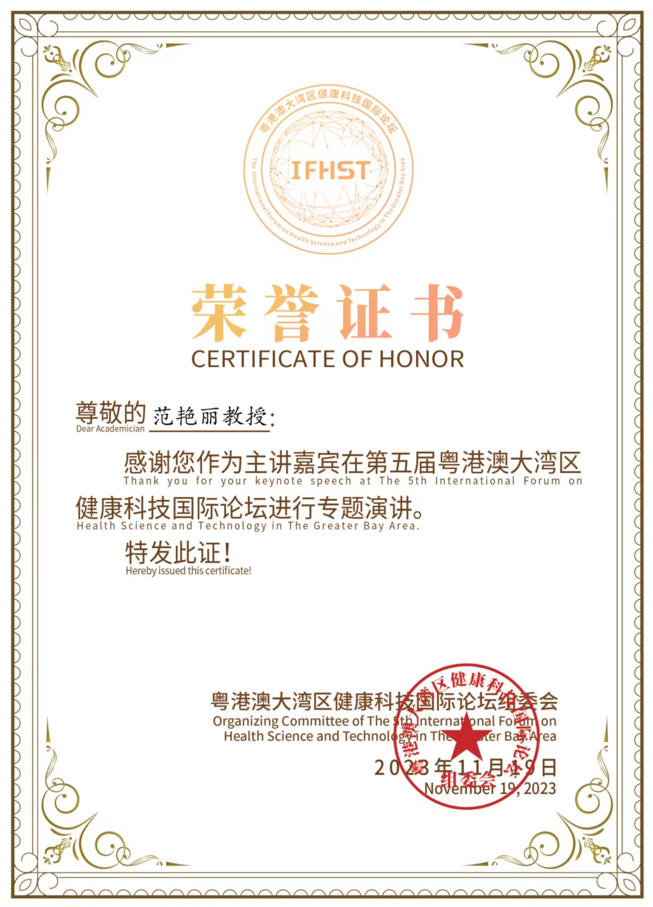 11月19日至20日,第五届粤港澳大湾区健康科技国际论坛于深圳市召开。我院范艳丽老师应邀于此次大会的“一带一路营养健康线上分论坛”作有关枸杞叶营养活性物质研究学术报告。