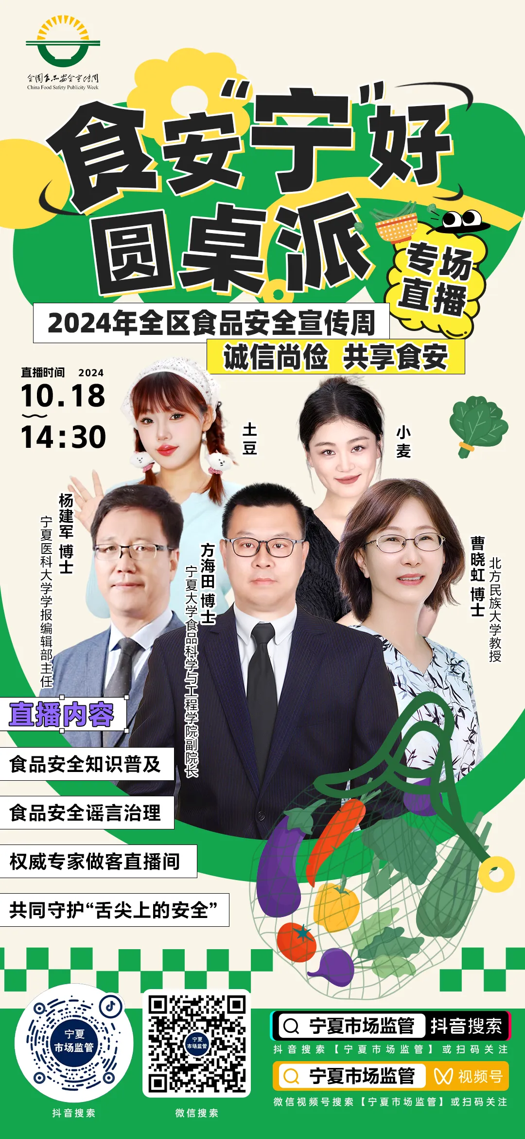 2024年10月18日,食品科学与工程学院副院长方海田教授应宁夏回族自治区市场监管厅的邀请参加了“食安宁好圆桌派”专场直播活动,活动主题为“诚信尚俭,共享食安”。作为特邀嘉宾,方海田教授与几位食品和营养等方面的专家就当前我国食品安全形势进行了解读,对食品营养与安全科普知识进行了宣讲与互动。