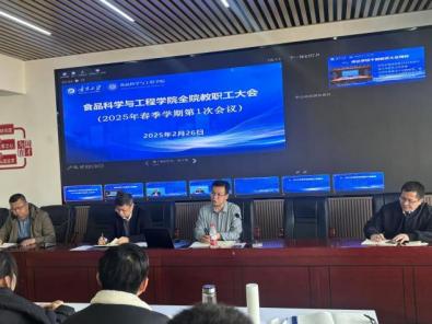 2月26日下午,食品科学与工程学院在明远楼五楼会议室召开2025年春季学期第一次全院大会,全面部署了新学期学院各项工作。会议由刘源院长主持,全体教职工参加,共同为学院的未来发展描绘新蓝图。
