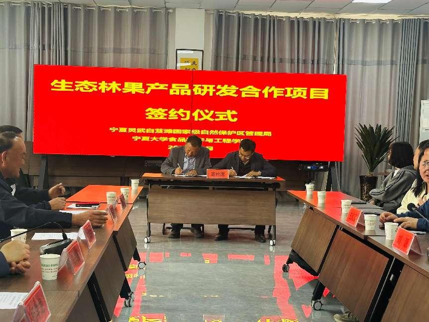 上午,学院领导、老师在灵武白芨滩国家级自然保护区管理局副局长万仲武的陪同下,一起来到白芨滩生态文明教育基地,先后观摩了白芨滩治沙奇迹,听工作人员讲述了《三代人与一片沙的情缘》,参观了全国防沙治沙展览馆,共上了微党课《一棵树的情怀》,并在宸喜园——习近平总书记植树点重温入党誓词。在灵武白芨滩国家级自然保护区管理局“生态林果产品研发合作项目签约仪式”上,管理局局长王兴东详细介绍了白芨滩六十余年的治沙经验与生态经济协同发展模式。他提到,通过沙区资源合理利用,白芨滩探索出“防沙治沙—生态修复—产业富民”的循环路径,沙区经济林果、枸杞、肉苁蓉等特色产业已形成规模效益,并表达借助食品学院科技人才助力产业新质生产力发展、真正把绿水青山变成金山银山的迫切愿望。学院党总支书记李文华表示,白芨滩的生态治理经验为食品学科发展提供了重要启示:“沙区特色农产品的深度开发、功能性食品研发与生态价值转化,是未来双方合作的重点方向。”座谈交流中,学院方海田副院长、李亚蕾教授、章中教授、范艳丽教授分别从微生物发酵、食品加工技术、无损检测、营养成分提取等角度,提出将沙区资源转化为高附加值产品的具体思路。双方还围绕沙区药食同源植物开发、生态产业链延伸等议题展开讨论,并签订《产学研战略合作框架协议》,约定在科研攻关、学生实践基地建设、成果推广等方面开展深度合作。