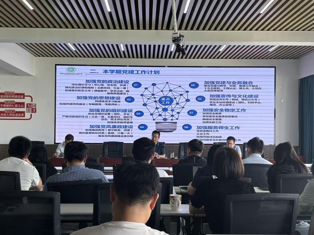 会上,李文华书记首先通报了学校新学期工作部署会有关情况,重点解读了提升“双一流”学科建设水平、推进中卫校区扩容提质、建设宁夏高等研究院、编制“十五五”规划方案、深化综合改革、提升拔尖创新人才培养质量、推进学位点倍增等内容,并结合深入贯彻中央八项规定精神学习教育评估、2025届毕业生就业包抓落实情况进行了汇报。随后,他对学院下半年党建工作进行总体部署,提出要在政治建设、思想建设、组织建设、党风廉政建设、党建与业务融合、宣传文化、安全稳定以及服务师生等八个方面持续发力。同时,他对近期重点工作作出安排,强调要扎实做好“十四五”总结与“十五五”规划编制、实验室维修改造与搬迁、学会党支部组建与党小组优化调整以及学院文化环境建设等任务。