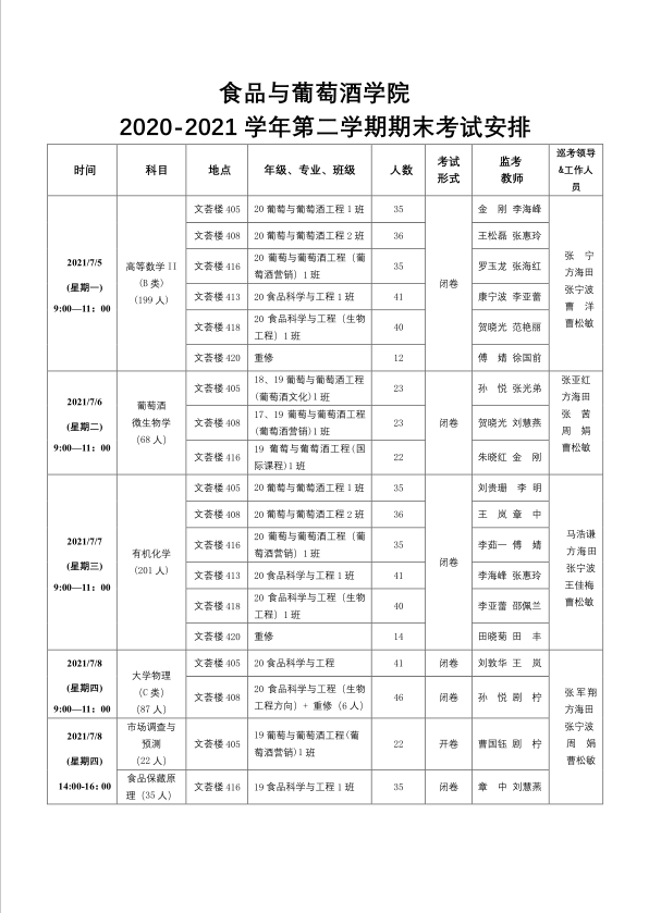 食品与葡萄酒学院2020-2021学年第二学期期末考试安排