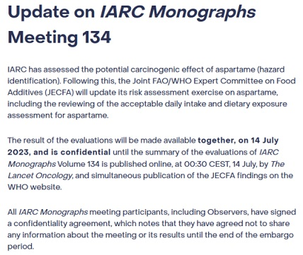 6月29日,世界卫生组织下的癌症研究分支机构(IARC)公开一则关于阿斯巴甜的最新研究情况,IARC评估了阿斯巴甜的潜在致癌作用,且食品添加剂联合专家委员会(JECFA)也在同步进行阿斯巴甜的风险评估工作,两个机构的评估结果将于7月14日同步发布。据路透社援引知情人士消息称,阿斯巴甜将被宣布为可能的致癌物质。消息一经公开,就把阿斯巴甜推上了风口浪尖,引起相关协会和行业的广泛关注和讨论。