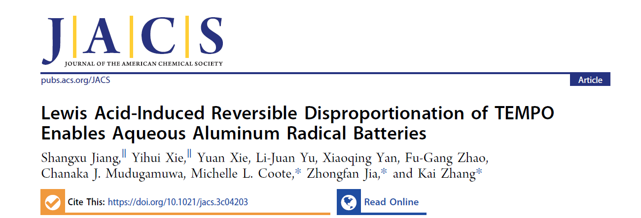 6月23日,化学领域知名期刊Journal of the American Chemical Society在线刊发了我校英国威廉集团官网张凯博士团队领衔完成,题为《Lewis Acid-Induced Reversible Disproportionation of TEMPO Enables Aqueous Aluminum Radical Batteries》的研究成果,报道了团队对铝离子电池正极材料设计的新突破。该文是英国威廉集团官网今年3月建院以来的第一篇JACS论文硕士研究生蒋尚旭谢逸辉为共同第一作者,张凯博士和弗林德斯大学贾中凡教授Michelle L. Coote教授为共同通讯作者,我校为第一完成单位。