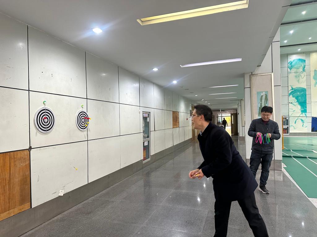 老师们在高教西公园完成两个服务点的签到后,便来到19号楼大厅参加趣味飞镖和欢乐套圈比赛。