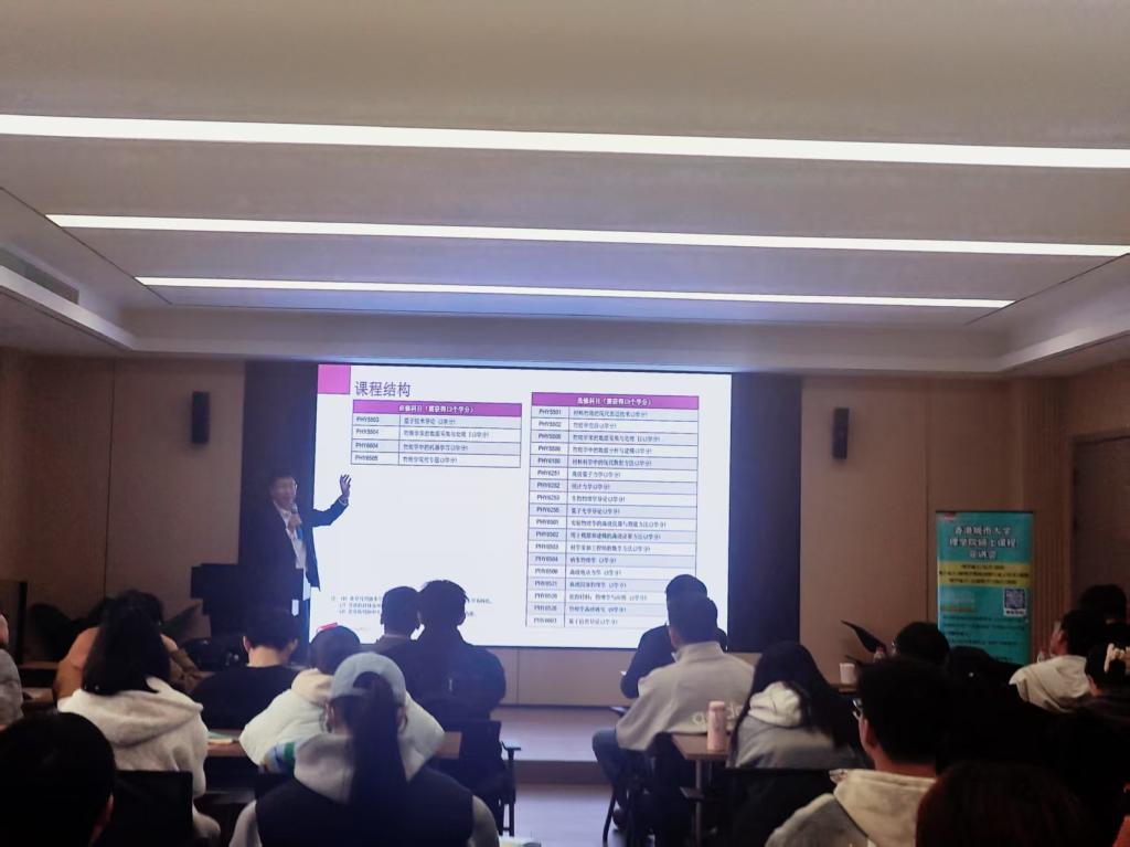 左彪对李丹枫一行的到来表示欢迎,也向同学们分享了自己在香港城市大学访学的经历。李丹枫为大家播放港城大的宣传片,随后介绍了香港城市大学的环境、学习与科研氛围、人才培养、政策等,欢迎同学们报考港城大研究生。黄勃龙向同学们介绍了化学系理学硕士的课程、师资力量、仪器与国家重点实验室等。柴愚介绍了物理系的硕士课程结构、申请方式与流程等。