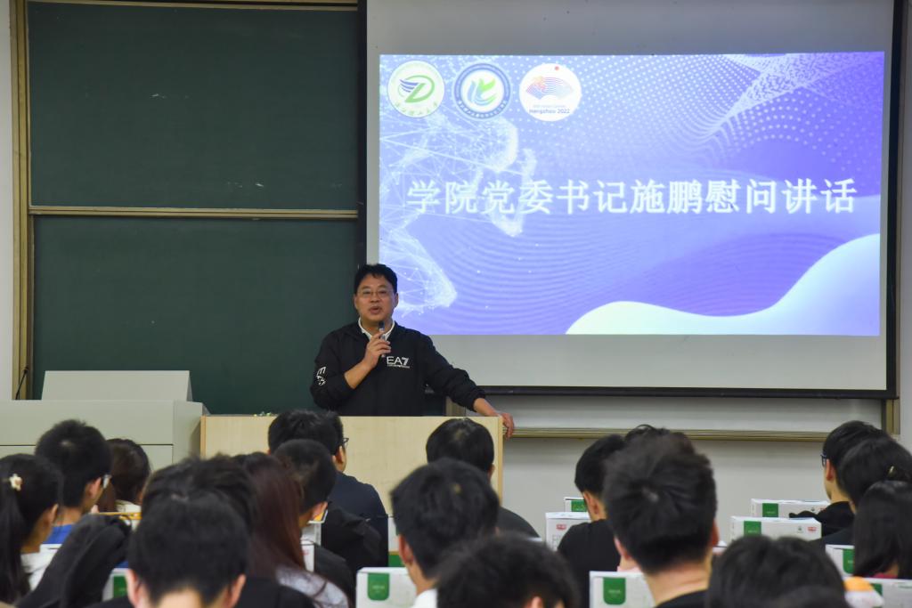 施鹏做慰问讲话。他指出,本次亚运会、亚残运会的举办是国家交给杭州的一次重大政治任务,各位志愿者高站位、高标准完成赛会志愿服务工作的事迹获得了社会各界的广泛认可和好评。每一位化院“小青荷”都克服困难,努力平衡好学习和志愿服务,彰显了当代青年有理想、敢担当、能吃苦、肯奋斗的精神风貌。施鹏还就后续赛会志愿服务做了动员,激励化院“小青荷”再次全员集结奔赴亚残运会,用奋进姿态、拼搏之力坚守岗位并应对挑战。