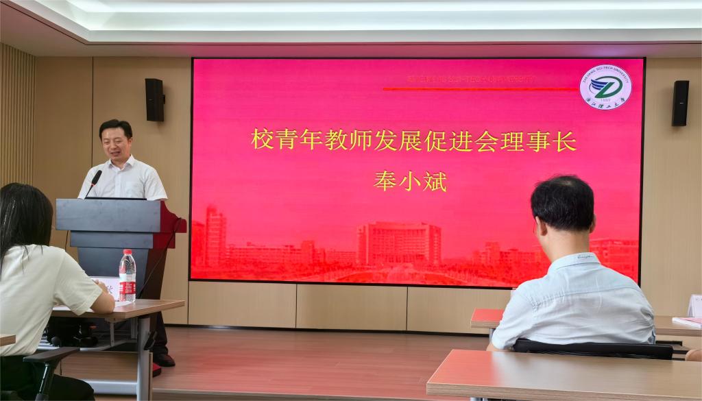 奉小斌为首届青促会授旗,青年教师张志军代表理事会接旗。