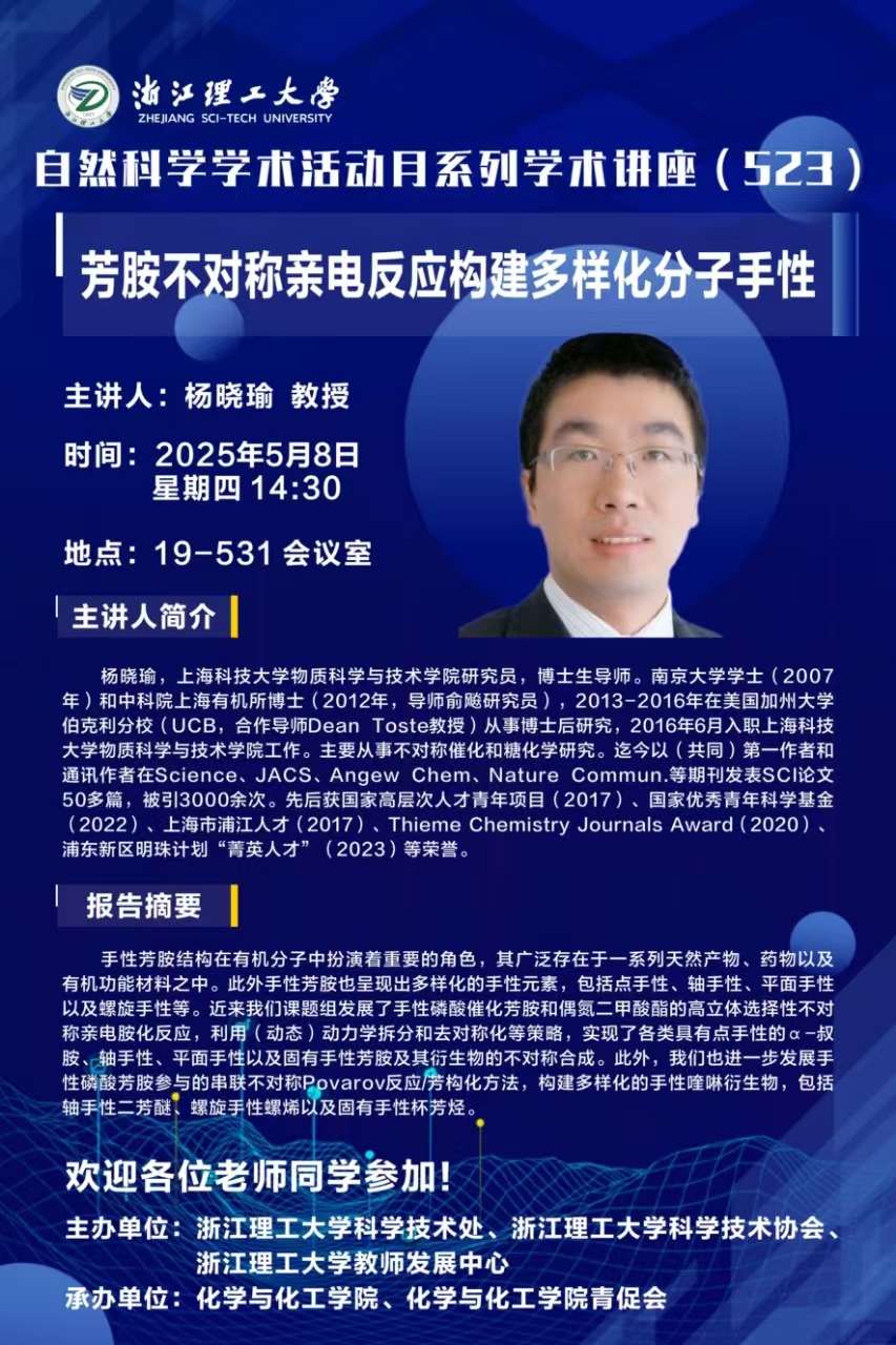 【学术讲座】芳胺不对称亲电反应构建多样化分子手性