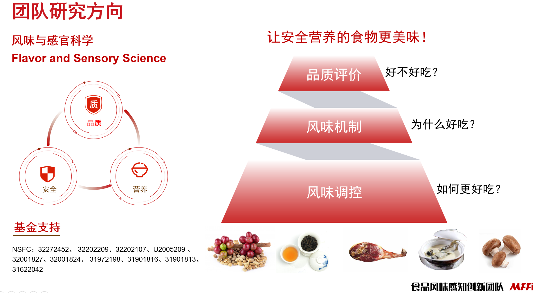 食品风味感知创新团队(Food Flavor Perception Innovation,MFFi)成立于2012年,团队秉承“以人为本,团结协作,开拓创新,追求卓越!”的宗旨,致力于高水平人才培养和人类美味生活!
